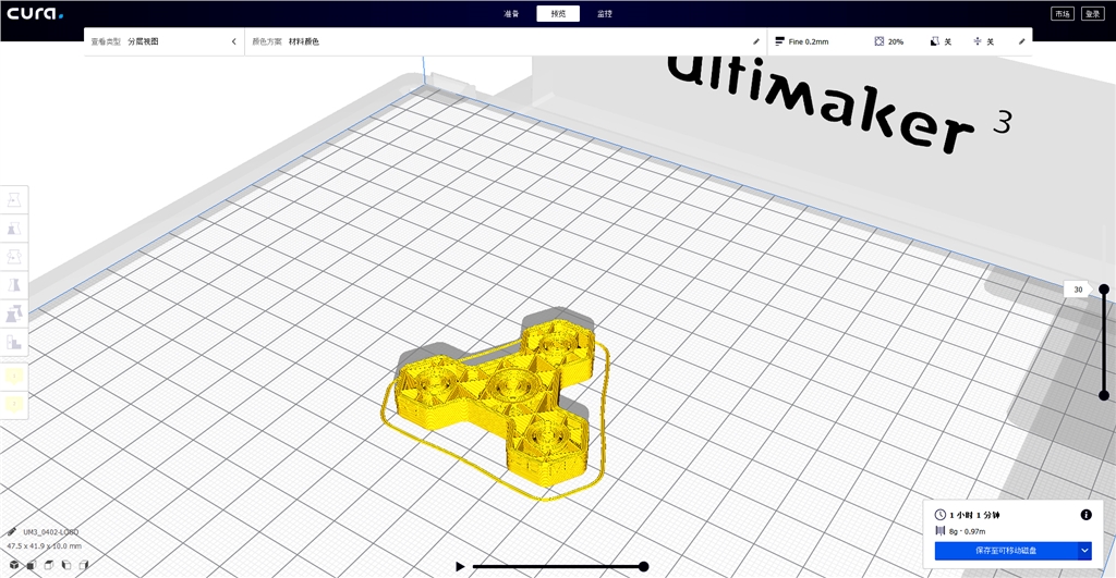 指尖陀螺材質(zhì)為PLA,使用Ultimaker 3D列印機(jī)一體成形列印完成、完全無須組裝、不額外使用培林(市售旋轉(zhuǎn)軸心),共有四個(gè)輪軸、皆可轉(zhuǎn)動(dòng);從最新版的Cura 4.0切片軟體當(dāng)中可以看到內(nèi)部結(jié)構(gòu),旋轉(zhuǎn)軸使用類似扯鈴的漸變?cè)煨?,讓它在無需支撐材的情況下也能順暢轉(zhuǎn)動(dòng),不會(huì)掉落。