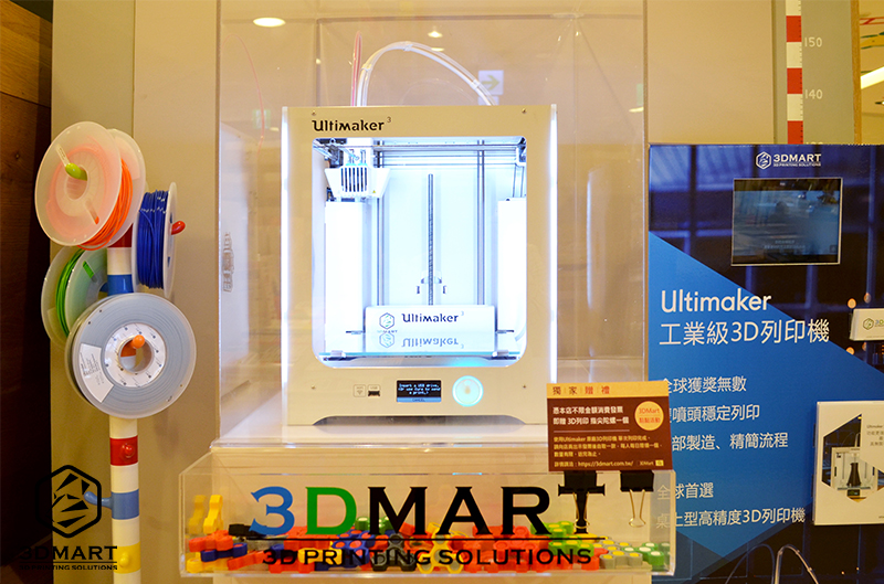 走進(jìn)誠品大門後會(huì)看到柱子中央有我們Ultimaker的展示牆,3D列印機(jī)會(huì)持續(xù)運(yùn)轉(zhuǎn)中,還沒看過的朋友可以一睹它的風(fēng)采。旁邊也展示了FDM的專用線材、影片介紹3D列印機(jī)在工業(yè)環(huán)境中的使用情況,讓小朋友能更加了解3D列印的周邊應(yīng)用;另外我們也特別降低了展示的高度,希望讓大人小孩都能看的到。