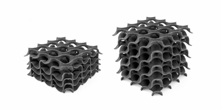 少量生產(chǎn)的3D列印,可以突破傳統(tǒng)生產(chǎn)的各項限制,除了滿足自由幾何、特殊結(jié)構(gòu)等需求,透過參數(shù)系統(tǒng)生成的衍生設(shè)計也可實現(xiàn)。 如圖中是由SLS雷射粉末燒結(jié)技術(shù)因為使用粉末堆疊,所以不需要支撐材就能3D列印中空結(jié)構(gòu),非常適合複雜結(jié)構(gòu)的原型,材料上也提供不同的需求的選擇,高硬度、高彈性....等。