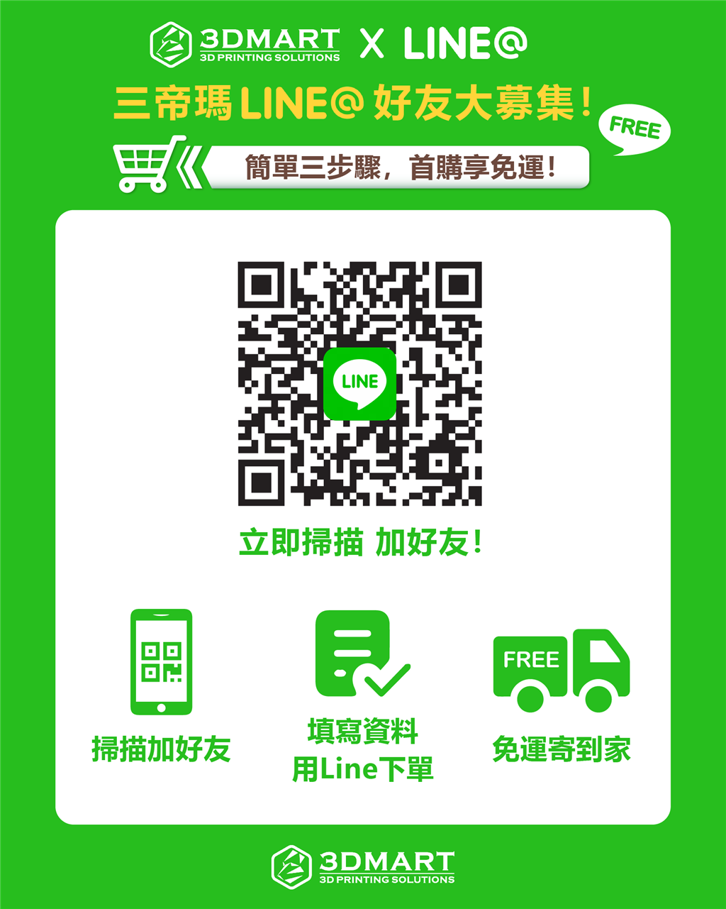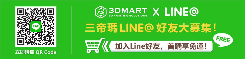 【3D列印優(yōu)惠】官方帳號上線啦!好友首購享免運! 三帝瑪現在也有官方Line帳號,讓商城購物更方便囉!快來加入3D列印生活圈,好友首次購物即享免運優(yōu)惠,3D列印線材、樹脂、配件通通有!快來加入Line好友! 好康只要三步驟!活動辦法帶你看: 1.掃描QR Code,加入官方Line好友。 2.輸入姓名、e-mail及電話(此為訂單及聯絡憑證,敬請確實填寫),用Line傳送商城購物內容。 3.享受免運優(yōu)惠,等待商品寄到家! *三帝瑪公司保留所有活動最終變更權利。 *注意事項:本活動僅適用於商城購物內容;不包含代印服務、掃描服務及技術支援,以上服務仍需進入官網系統(tǒng)才可成立訂單。 .代印服務點我 .掃描服務點我 .技術支援點我 追蹤粉絲專頁、抓住3D技術:https://www.facebook.com/m.midday800.com/