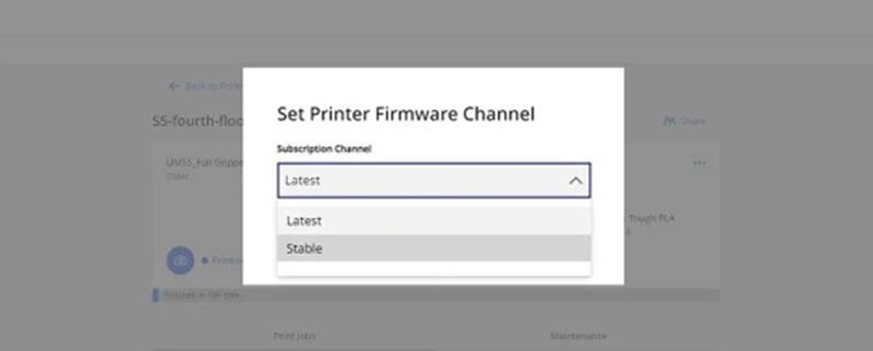 的維修狀態(tài),可以確保每臺(tái)機(jī)器都保持在最佳運(yùn)作狀態(tài),有效避免外力狀況、保持穩(wěn)定生產(chǎn)力;首選韌體頻道「Set Printer Firmware Channel」功能,可以設(shè)定自動(dòng)、手動(dòng)遠(yuǎn)端更新,並能接到每次系統(tǒng)最新的更新通知。
