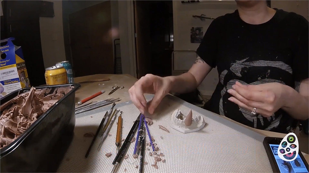接著使用黏土在石膏模型上加工喜歡的造型,以相同步驟製作模具,再灌入牙科專用的樹脂製作道具上的牙齒款式,最後再使用顏料、酒精為道具上色、拋光。