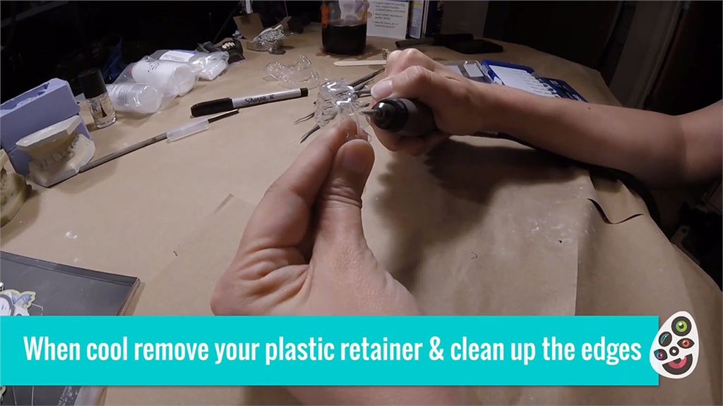 為了讓模型底部更平整以便後續(xù)加工,可在牙齒模型底部再注入石膏;接著將牙齒模型放入FormBox真空成型機(jī)、搭配透明注塑材料片進(jìn)行吸塑,下壓只需3秒!脫模後依照牙齒造型切割材料片,道具牙齒的基底即可成型。