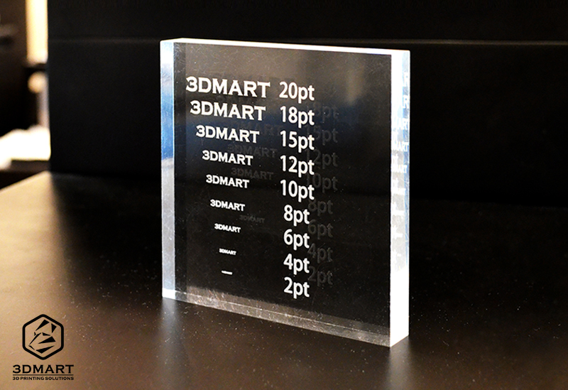 字體大小從20pt排列至2pt,最小的字體高約0.7mm,仍可以呈現(xiàn)出3DMart的標(biāo)誌,小到相機(jī)難以對(duì)焦;以目前內(nèi)部的測(cè)試品而言,MUSE雷射加工機(jī)的品質(zhì)在應(yīng)用上綽綽有餘,我們?cè)?a href="http://m.midday800.com/en/news/3dprinting-exhibition-in-taiwan-2019">3D列印展的S423攤位現(xiàn)場(chǎng)也可以看到這些樣品喔!
