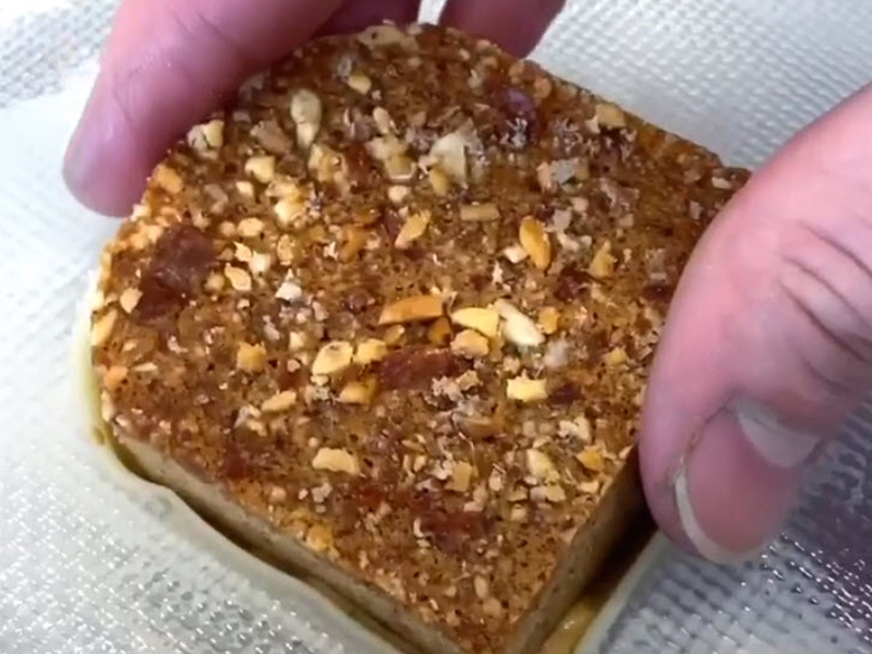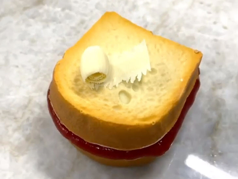 艾莫里師傅重複以上的動(dòng)作,分別製作三明治外皮造型、核桃花生果仁糖的內(nèi)餡,並在周?chē)鷶D上草莓果醬,最後噴上甜點(diǎn)專(zhuān)用的食用噴漆,仿真程度超高;經(jīng)過(guò)簡(jiǎn)單、快速的製作過(guò)程,美式經(jīng)典三明治的精緻甜點(diǎn)就完成了!