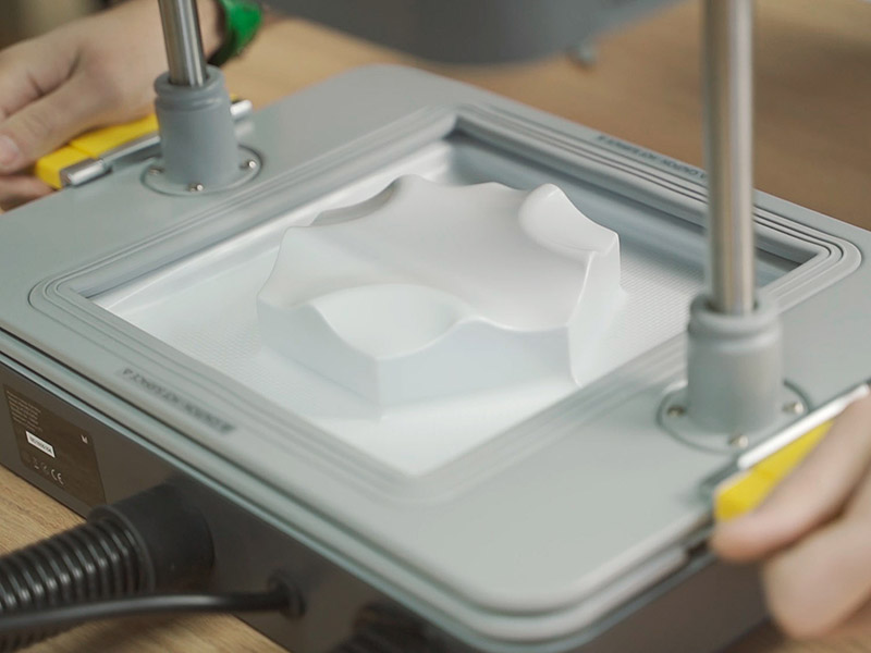 ,只要手動(dòng)下壓,機(jī)器就會(huì)快速吸塑模型造型,3秒即可完成模具;沿著模型邊緣,割掉多餘的真空成型材料片,脫模後燈具的上蓋就完成了!
