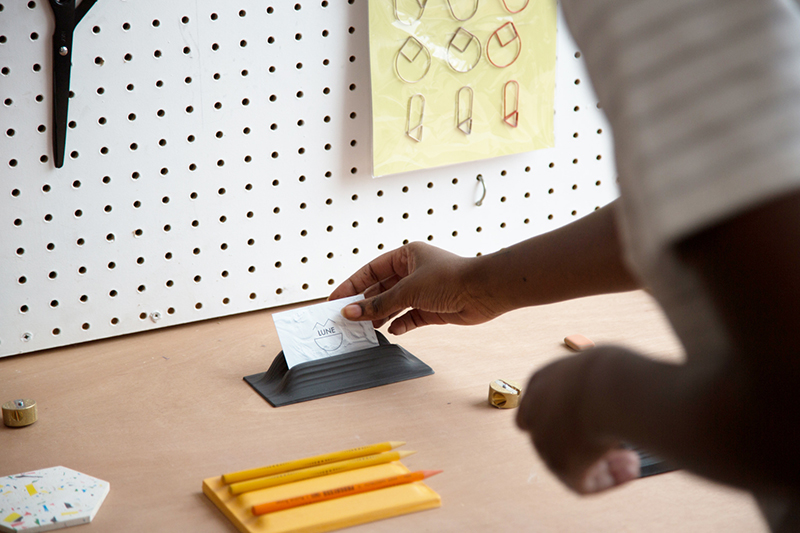查理設(shè)計了一款擁有密集山脊紋路的「名片夾」,首先他使用雷射切割機(jī),針對容易取得的材料(例如:木板、紙板、橡膠)進(jìn)行切割,再將切片黏在一起就完成,細(xì)緻的階梯紋路生成超簡單!初步完成造型設(shè)計後,將物件放進(jìn)真空成型機(jī)、搭配真空成型材料片,下壓3秒吸塑物件外型。