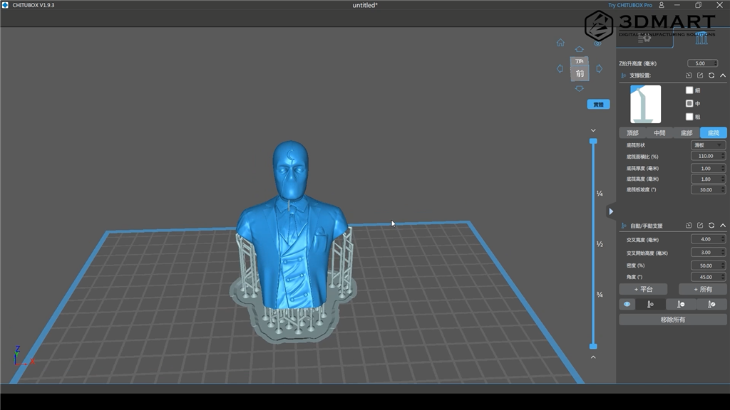 5. 數(shù)據(jù)設(shè)定完成後,拖拉右方滑軌可以檢視、模擬實際成型過程,在開始3D列印前檢查模型的每個懸空處,是否都有完整建立到支撐。