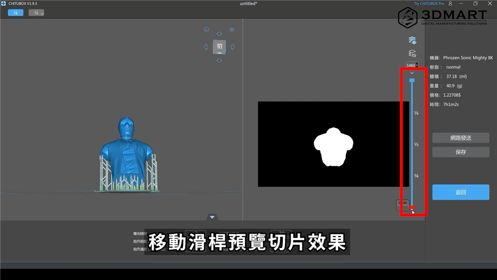 最後點選「切片」即可獲得模型切片檔,軟體運算後會顯示詳細(xì)內(nèi)容,包含材料樹脂類型、列印時間;將檔案存入USB後上傳至機(jī)器,在Phrozen Sonic Mighty 8K內(nèi)讀取後開始列印。