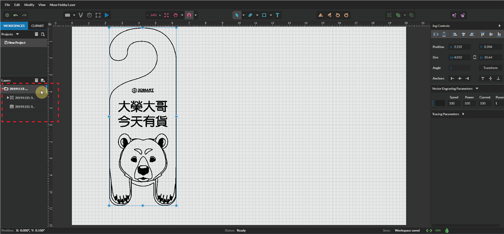 首先,可以用AI(Adobe Illustrator)軟體繪製喜歡的圖案或下載開(kāi)源圖片,轉(zhuǎn)存為PDF格式後丟入MUSE的專(zhuān)業(yè)軟體「RetinaEngrave v3.0」。這個(gè)軟體不用下載,只需要將MUSE操控面板上的IP位址輸入到瀏覽器上就會(huì)自動(dòng)開(kāi)啟,並將剛才的PDF檔置入即可。