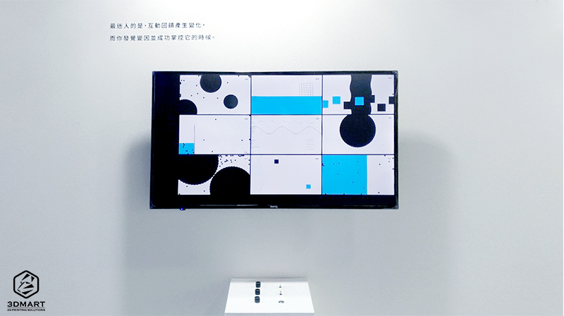 展場入口處就有許多小巧思,觸控屏中的動畫會因為觀眾的調(diào)整產(chǎn)生不同的隨機律動。而籠子裡關(guān)著許多3D列印的「反應(yīng)粒子」,代表著躍動不安、活潑的要素,仔細看共使用兩種不同的3D列印線材做出不同的反光效果。(延伸閱讀:北科互動設(shè)計展,消光線材搶先看!)