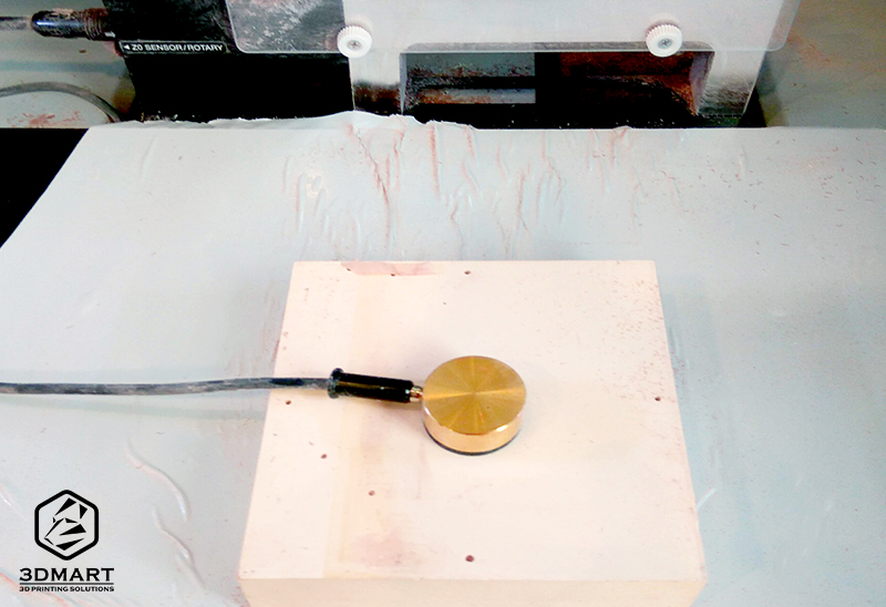 平臺(tái)上方需先放置一塊墊底的角料,並將圓形的金屬校準(zhǔn)工具約略放在角料的上方中心點(diǎn),機(jī)器會(huì)透過(guò)這個(gè)校準(zhǔn)工具進(jìn)行定位,接著才放上欲切削的原料塊並同樣再次做中心點(diǎn)定位。