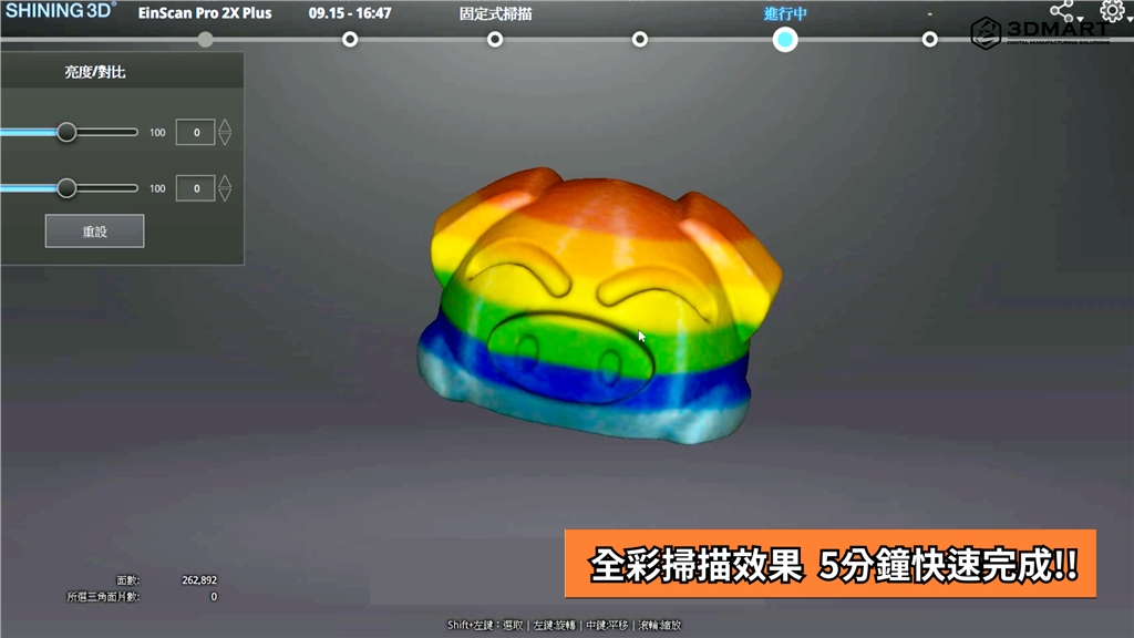 首先,我們針對(duì)彩虹小豬模型(6 x 4 x 2.5cm),使用「Einscan Pro HD」搭配專(zhuān)用的「彩色紋理相機(jī)」進(jìn)行彩色掃描;透過(guò)轉(zhuǎn)盤(pán)模式自動(dòng)旋轉(zhuǎn)、不必手動(dòng),5分鐘內(nèi)即可完成掃描,作業(yè)過(guò)程中也能直接在掃描軟體中,預(yù)覽彩色掃描成像結(jié)果。