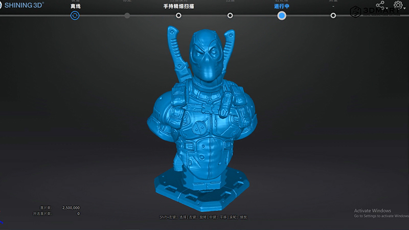 接著我們使出細(xì)節(jié)度高、結(jié)構(gòu)複雜的3D列印死侍(20 x 18.5 x 15cm),來(lái)挑戰(zhàn)Einscan Pro HD的掃描效果,使用手持高清模式,環(huán)繞掃描模型的每個(gè)面向,可以依照模型大小自由移動(dòng),掃描範(fàn)圍廣泛不受限;3D掃描物是黑色布料、透明玻璃、金屬反光等會(huì)影響光照結(jié)果的材質(zhì),別擔(dān)心!只要在表面噴上掃描噴粉顯像劑,就可以順利進(jìn)行掃描?。?a href="http://m.midday800.com/en/news/aesub-3d-scanning-powder-shining-scanner">點(diǎn)我看:自動(dòng)消失的掃描噴粉?)