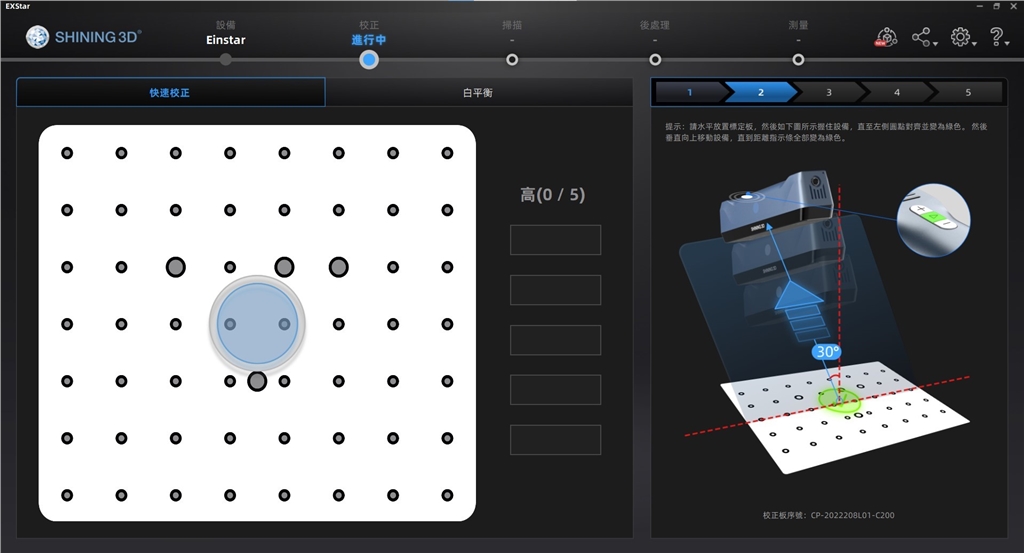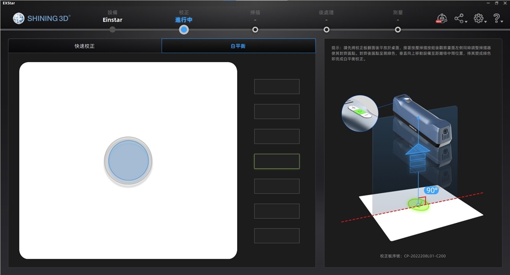 Shining 3D EinStar附有專用「校正板」,在開始3D掃描之前,只需依照軟體指示,對準(zhǔn)掃描方框進(jìn)行校正,即可輕鬆完成系統(tǒng)校正。分成兩個步驟,快速校正;總共需要從5個不同的角度(上、斜前、斜後、斜左、斜右)進(jìn)行擷取。白平衡;緩慢平穩(wěn)的上下移動掃描設(shè)備,在軟體提示中合適的高度時(shí),掃描設(shè)備會自動擷取並完成白平衡校正。