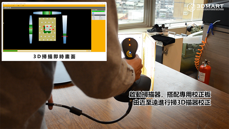 依照SHINING 3D掃描軟體的步驟,對準(zhǔn)校正板進(jìn)行校正,啟動掃描器開關(guān),由下往上緩慢移動,直到所有綠色色塊都打勾;使用專用支架將校正板墊高,依照軟體中指示,接續(xù)進(jìn)行校正。