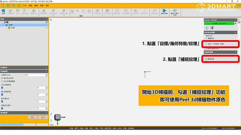 完成3D掃描後,開啟顯示「掃描紋理」結(jié)果,可以直接看見物件原色;開啟「網(wǎng)格」可顯示掃描網(wǎng)格結(jié)果。