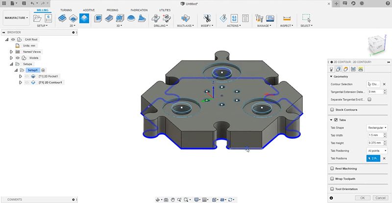 為了避免過(guò)程中切割下來(lái)的物件,會(huì)在工作區(qū)域中移動(dòng),甚至影響其他在雕刻的結(jié)構(gòu),在右側(cè)工具列中點(diǎn)選「Tabs」功能,可以讓物件在加工過(guò)程保持固定。(Tabs>Tab Positioning>At points>使用滑鼠在模型底部輪廓上手動(dòng)設(shè)定)
