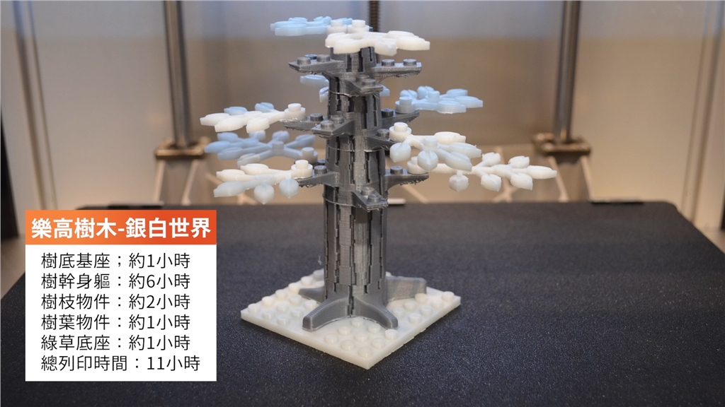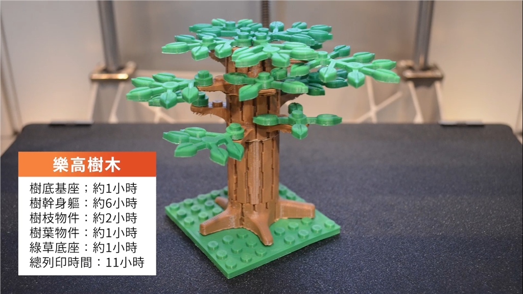 將所有列印物件組合成樂(lè)高樹木,總耗時(shí)約11小時(shí),且能放入不同顏色線材列印。可組裝2個(gè)不同顏色樹木!