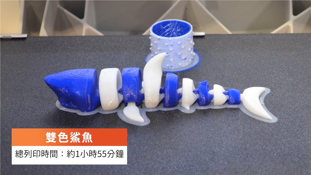 Snapmaker J1內(nèi)建3個(gè)列印物件,鯊魚模型是具備可活動(dòng)性的關(guān)節(jié)。顏色分層乾淨(jìng)沒(méi)污染。