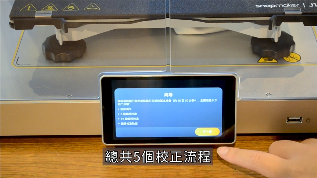 Snapmaker J1有自動(dòng)化校正流程,支援中文語(yǔ)系。依序按照螢?zāi)灰龑?dǎo)流程即可。每一個(gè)校正步驟螢?zāi)欢紩?huì)顯示怎如何校正,省時(shí)不費(fèi)力。