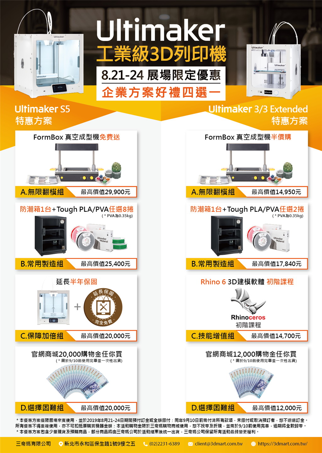 首先預(yù)告大家最關(guān)心的Ultimaker S5、Ultimaker 3/3 Extended更有年度最優(yōu)惠的「企業(yè)方案四選一」,其中史無前例的「方案A」直接免費(fèi)送一臺(tái)FormBox真空成型機(jī)、完全是買一送一,現(xiàn)貨數(shù)量剩不多、到場朋友請把握!