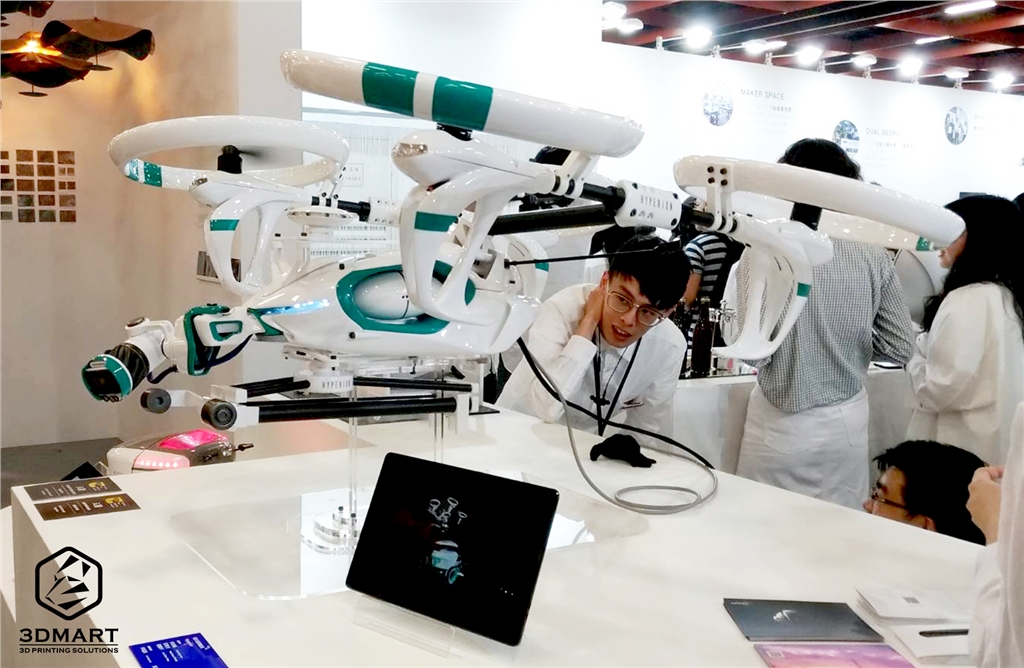 工業(yè)設(shè)計(jì)類有許多突破性的成果,這臺(tái)超越觀賞模型、真實(shí)可動(dòng)的四軸飛行器,除了前方攝影鏡頭可像機(jī)械手臂一樣360度無(wú)限旋轉(zhuǎn)外,因?yàn)閯?dòng)能太強(qiáng),甚至差點(diǎn)「掙脫」固定架在展場(chǎng)內(nèi)直接起飛。