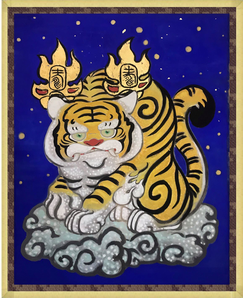 2020年開始,全球受到新冠肺炎(COVID-19,武漢肺炎)的衝擊,各界陷入低潮,臺灣本土藝術(shù)家.方志偉,以虎爺?shù)男蜗?,使用膠彩、絹本等媒介創(chuàng)作了藝術(shù)作品「金花虎爺The Keeper」,希望能帶給人們溫暖的正能量、安撫人心並帶來福氣。