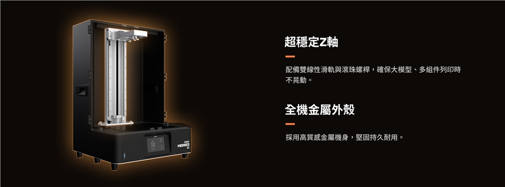 Sonic Mega 8K V2 擁有超大尺寸載臺(tái) 33 x 18.5 公分與超高40公分Z軸,一次完成超大尺寸或多分件模型,無需分次列印。