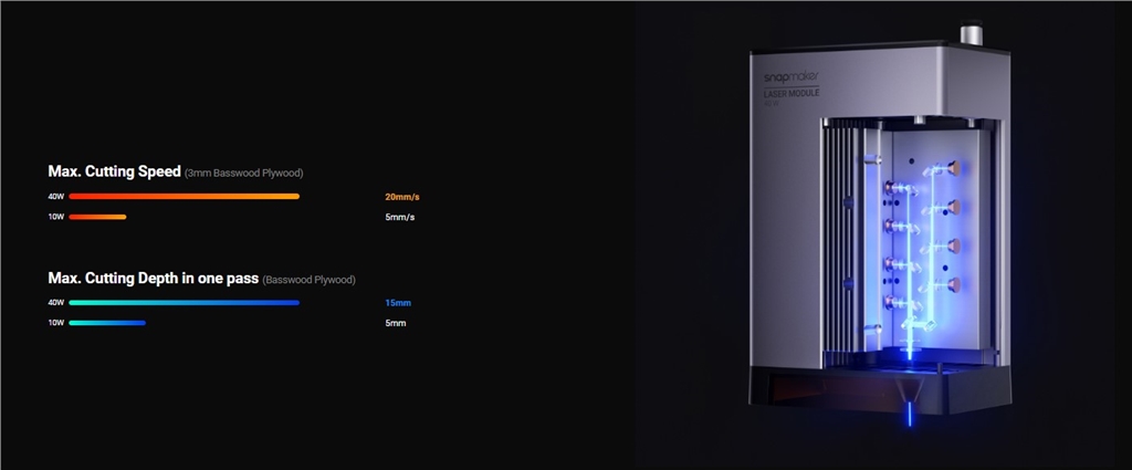 The 40W Laser Module delivers superb performance with the most cutting-edge laser beam splitters and beam shaping optics. When it comes to the speed of cutting 3mm Basswood Plywood, 40W Laser Module is 4 times that of 10W
