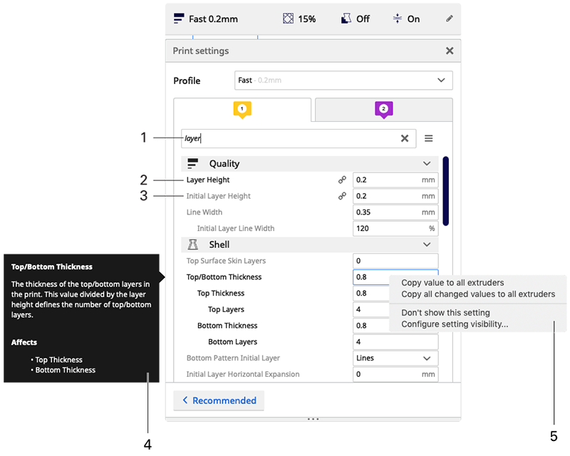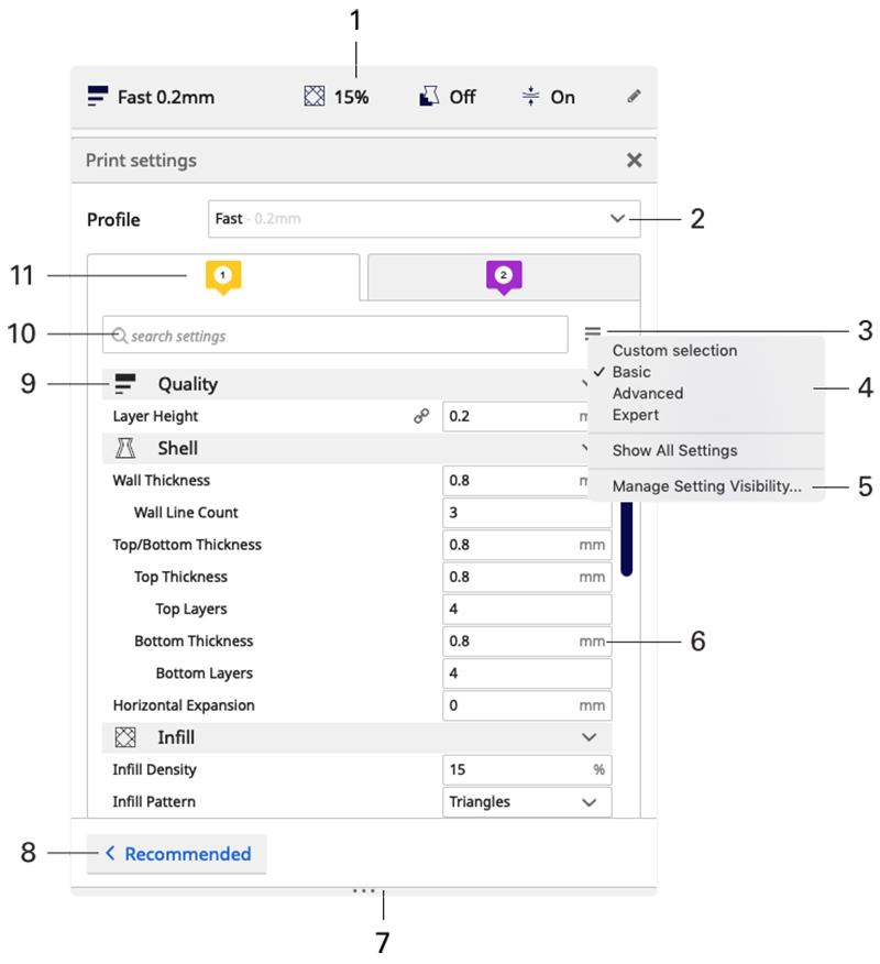 Ultimaker Cura的設(shè)定面板中有推薦與自訂模式,推薦模式適用於初學(xué)者,而自訂模式能為有經(jīng)驗(yàn)的用戶提供更多的設(shè)定。