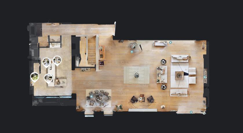 Matterport內(nèi)部近景模式,就像玩RPG遊戲一樣,只要點選地上的圓點,就能在3D虛擬空間中自由移動,無論在哪裡都像身歷其境一樣;滑鼠只要點選Mattertags標籤,就能看到想買的商品詳細的材質、版型、尺寸。