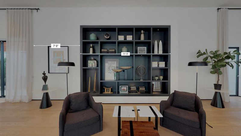 Matterport的測量尺寸模式,會自動偵測室內(nèi)空間的牆壁、門、窗戶之間的距離,可以在3D虛擬空間中擬定你的室內(nèi)裝潢計畫。