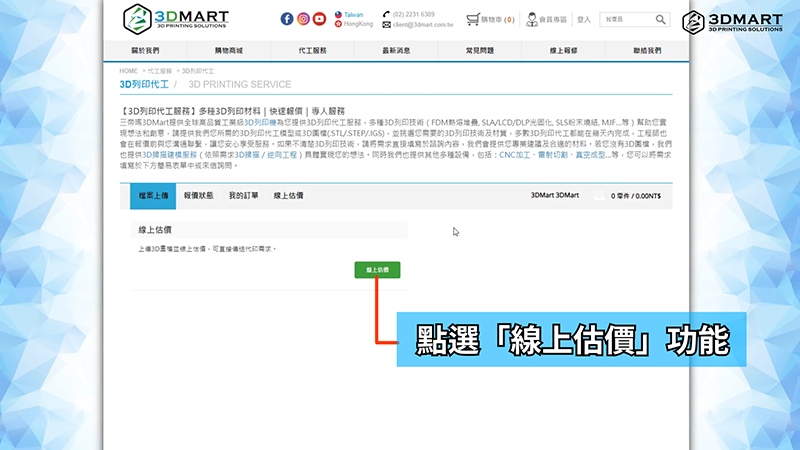 進(jìn)入新版3D列印代工頁面,會(huì)看見檔案上傳、報(bào)價(jià)狀態(tài)、我的訂單、線上估價(jià),四大主要功能;點(diǎn)選綠色按鈕「線上估價(jià)」,以瀏覽、拖移檔案的方式,選擇指定的CAD檔案後,即可簡單上傳3D模型檔案。