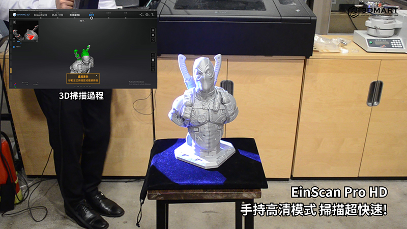 逆向操作!我們還使用Shining Einscan Pro HD手持高清模式,針對死侍模型進(jìn)行3D掃描(點(diǎn)我看:死侍3D掃描完整記錄),環(huán)繞掃描模型的每個(gè)面向,可以依照模型大小自由移動(dòng),掃描範(fàn)圍廣泛不受限;3D掃描物是黑色布料、透明玻璃、金屬反光等會(huì)影響光照結(jié)果的材質(zhì),別擔(dān)心!只要在表面噴上掃描噴粉顯像劑,就可以順利進(jìn)行掃描!