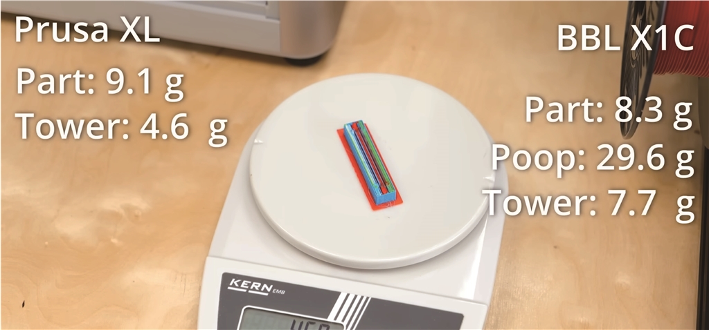 例如,透過我們最壞情況的測(cè)試(每層都需要更換三次工具的圓柱體),完成的列印件僅重 9.1 克,而擦拭塔則增加了約 4.6 克。