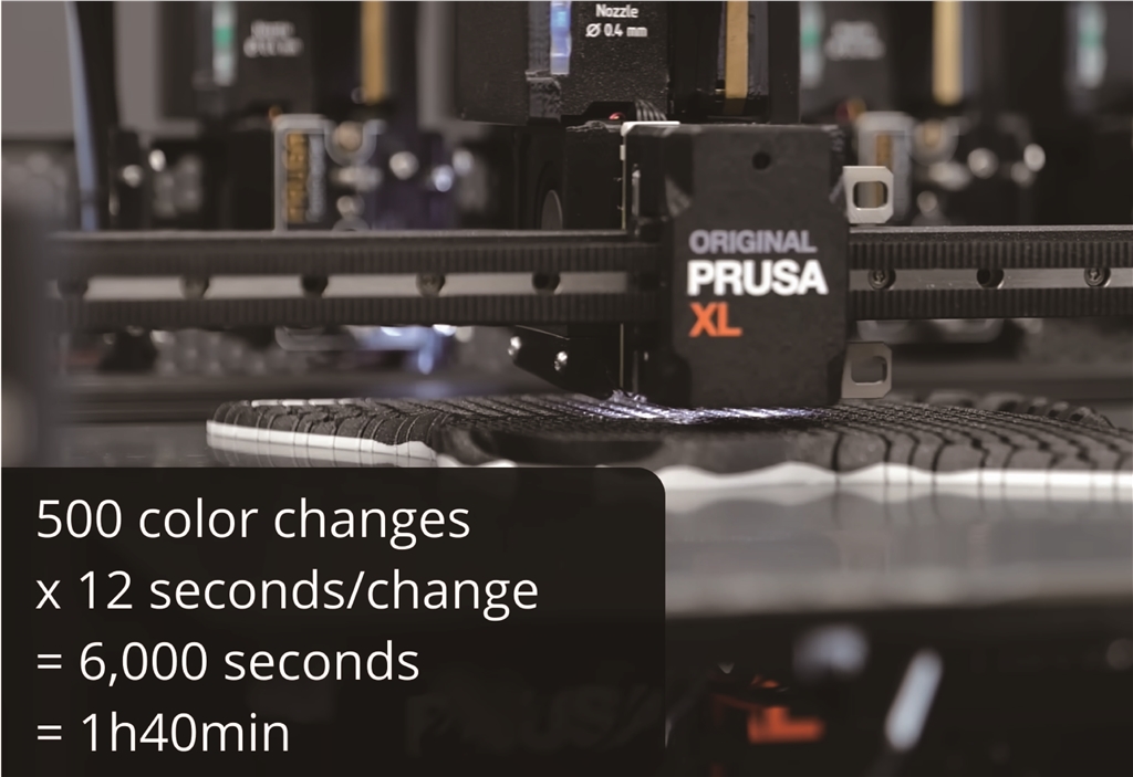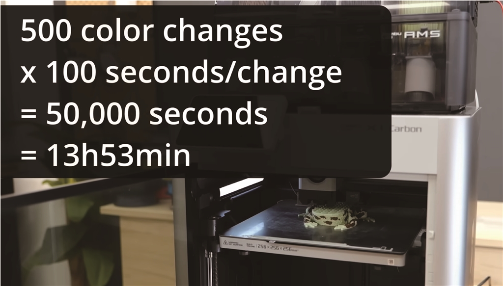 換個(gè)角度來說:如果你有 500 種顏色變化,每次平均需要 100 秒,也就是說光是切換顏色和產(chǎn)生廢物就花了近 14 個(gè)小時(shí)。