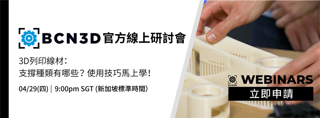「支撐」是什麼?哪種適合你?使用訣竅有哪些?BCN3D團隊官方線上研討會,於4/29(四)登場,主要介紹「3D列印支撐線材」種類、教學使用技巧、分享實際應用效果,免費學習機會,內附連結馬上申請: