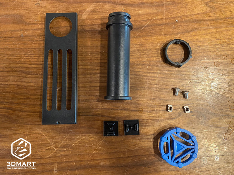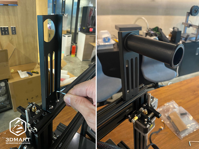 使用平圓頭螺釘M5X8、M5T型螺母,將3D列印線材架安裝於軸桿上。
