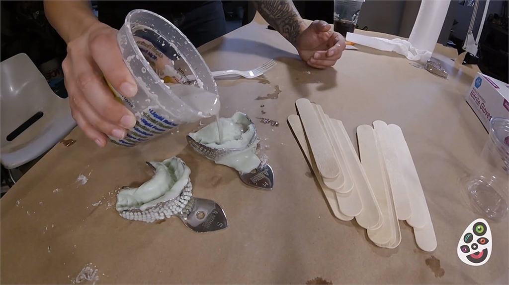 接著使用黏土在石膏模型上加工喜歡的造型,以相同步驟製作模具,再灌入牙科專用的樹脂製作道具上的牙齒款式,最後再使用顏料、酒精為道具上色、拋光。