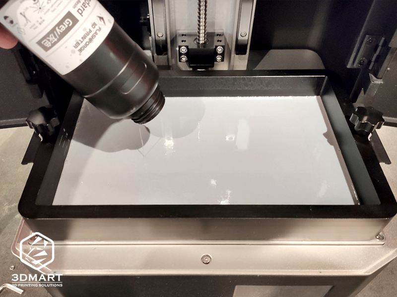 接下來,搖晃光敏樹脂並倒入樹脂槽,樹脂量可依照樹脂槽內(nèi)的標記線為主,最後將3D列印機的遮蔽光門關(guān)上。