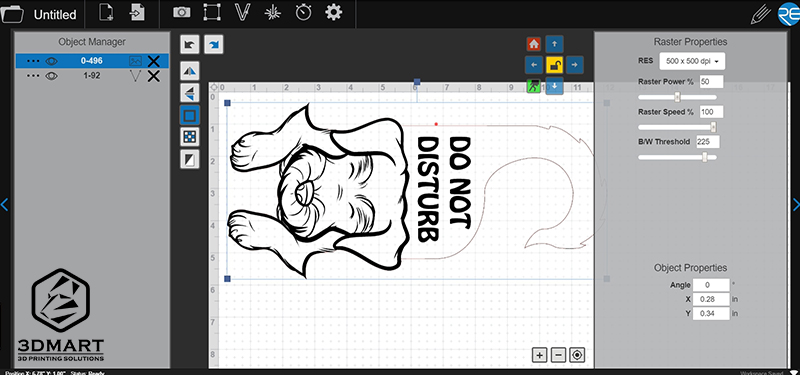 我們?cè)诰W(wǎng)路上抓了一款免費(fèi)素材(延伸閱讀:免費(fèi)資源不藏私!5大3D模型庫(kù)都在這!)是可以掛在門(mén)外、表示「請(qǐng)勿打擾」的吊牌做測(cè)試,丟入RetinaEngrave v2軟體介面內(nèi)可以自由縮放大小、預(yù)視切割範(fàn)圍,右邊的欄位可以調(diào)整雷射加工的精細(xì)度或強(qiáng)度,整體為直覺(jué)式操作且方便易懂。