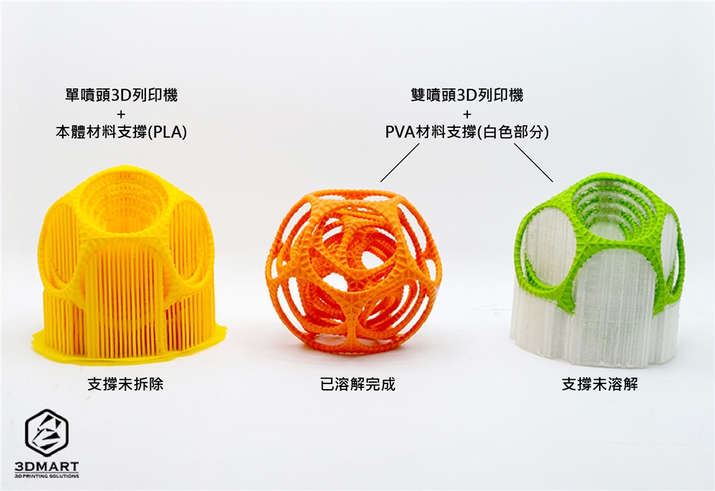 白色部分為PVA,是可生物分解的水溶性材料,搭配PLA結(jié)構(gòu)本體列印後,連同本體浸入一般冷水中即可溶解(如果配置打氣筒或超音波震動(dòng)增加水流可加快約兩倍速率),完成後直接取出物件清洗乾淨(jìng)即可,是雙噴頭系統(tǒng)中最廣受歡迎的用法(若使用非獨(dú)立式雙噴頭3D列印機(jī)可能無(wú)法消除黏膩感)。