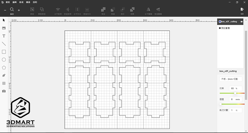 (在Beam Studio軟體中,選擇切割3mm木板模式:功率60%/速度6mm/s)