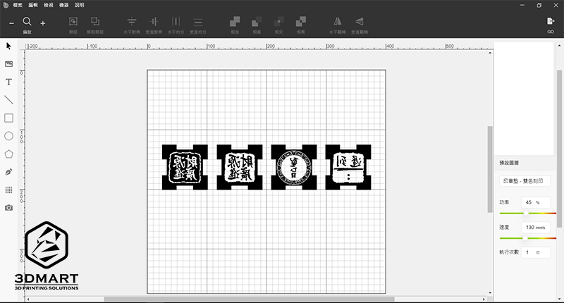 (在Beam Studio軟體中,選擇印章雕刻模式:功率45%/速度130mm/s)