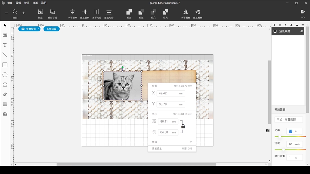 雷射雕刻前使用FLUX專(zhuān)用的編輯軟體Beam Studio,匯入物件後可以調(diào)整大小、設(shè)定座標(biāo)、旋轉(zhuǎn)、對(duì)齊…等多功能,「雷射設(shè)定」中也能依照需求選擇開(kāi)啟漸層模式、設(shè)定曝光數(shù)值。