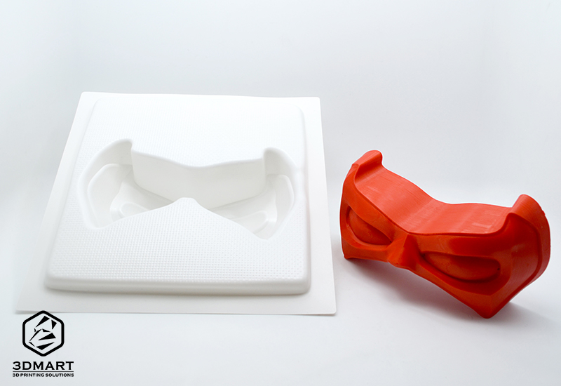 其中一個(gè)真空成型的關(guān)鍵是設(shè)計(jì)上可以考慮到的技術(shù)原理,在面具眼窩處有凹槽的地方可以看到總共四個(gè)小小的穿透圓孔;這個(gè)設(shè)計(jì)是在抽真空的過程中,讓空氣可以順利離開凹槽的氣孔,這能使凹槽處的殼模能更加服貼表面造型。
