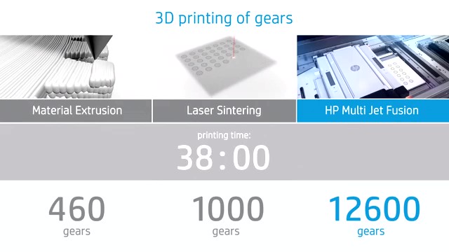 MJF 是一種快速的增材製造技術(shù),這是HP 3D列印機(jī)的最大亮點(diǎn),它超越普通技術(shù)的10倍。下圖可以看到同樣花費(fèi)38小時,左邊的擠出技術(shù)(=FDM熔融堆積)列印出460個;中間的雷射燒結(jié)(SLS)技術(shù)稍微好一些印出1000個;但是最右邊的多射流熔融(Multi-Jet Fusion)技術(shù)足足超越前兩個印出12600個!! 證明了HP 的 3D列印機(jī)可因應(yīng)客戶短時間內(nèi)的需求。