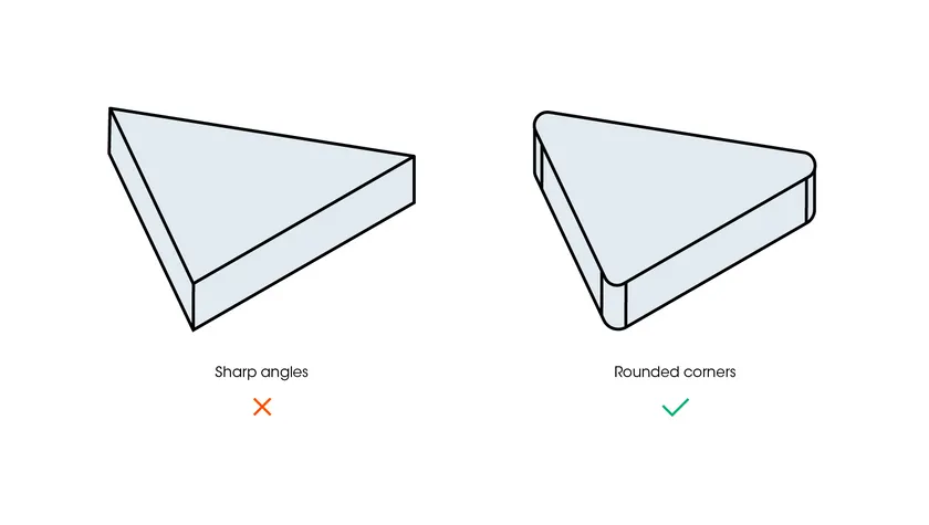 熱成型並不適用於具有銳利角(小於90°)的模板。除了最小的傾斜角度,銳利的垂直角更容易導(dǎo)致塑膠片在成型過程中出現(xiàn)網(wǎng)狀撕裂。為了避免這種情況並提高部分質(zhì)量,請確保模板的所有角落和邊緣都是圓的。