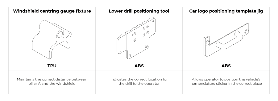 這個(gè)夾具是一個(gè)黨擋風(fēng)玻璃定心儀,它能保持汽車(chē)A柱和擋風(fēng)玻璃之間的正確距離。當(dāng)把量規(guī)固定在汽車(chē)零件上時(shí),它會(huì)固定住一邊,當(dāng)反過(guò)來(lái)時(shí),又會(huì)固定住另一邊,確保了準(zhǔn)確性並加快了進(jìn)程。這個(gè)部分的尺寸是100x120x80mm,採(cǎi)用了堅(jiān)固的TPU材料來(lái)打印,花費(fèi)8歐元,耗時(shí)14小時(shí)。